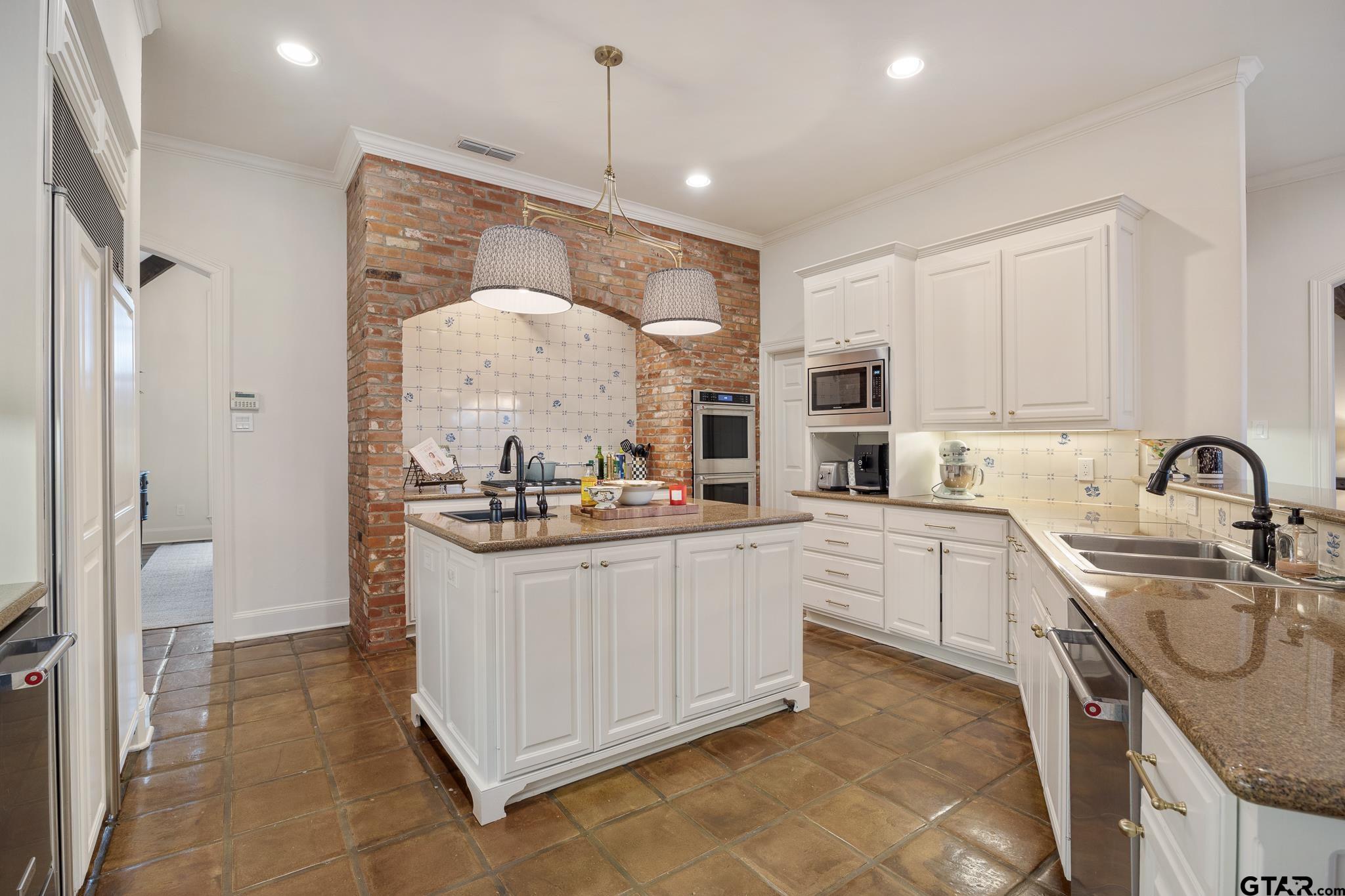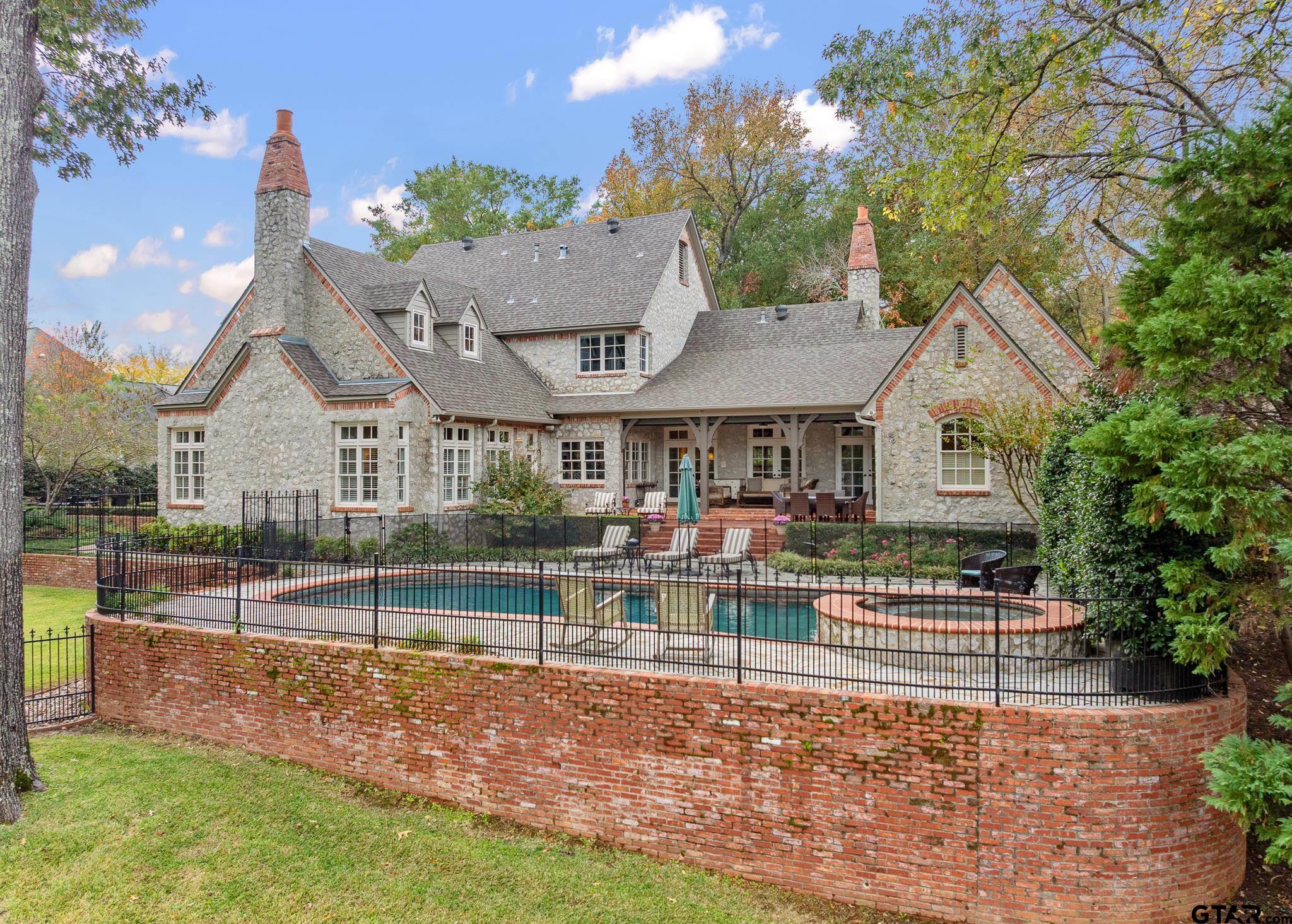 | Show-stopping curb appeal with a stone and brick French country exterior and landscaped circle drive on 1.38 acres in Hollytree! The gorgeous gothic-arched wooden front doors open into a foyer flanked by a formal living area with fireplace to the left and a formal dining with vaulted ceilings to the right. Beautiful kitchen includes a gas range in an arched brick opening, island with veggie sink, double ovens, custom fridge, ice machine, tons of workspace, walk-in pantry, and nearby wet bar. Additional seating at the breakfast bar and breakfast room. A spacious second living area has a fireplace as a focal point, decorative beams, and is surrounded by windows on three walls, giving you a great view of the back yard. The primary suite is split for extra privacy and has his/her walk-in closets and spa-like en suite bath. One guest room is downstairs and has a beautiful full bath nearby. Upstairs you'll find two guest rooms, each with a full bath, and a third living space. The dreamiest back yard includes a covered porch, large open patio, in-ground pool and spa (with perimeter fence), and a large fenced yard that's the perfect place for kids and pets to play! Located a quick golf cart ride to the Hollytree clubhouse and tennis courts! | |